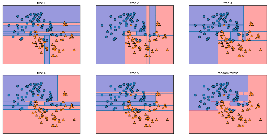 forest = RandomForestClassifier(n_estimators=5, random_state=2) #5개의 트리를 생성